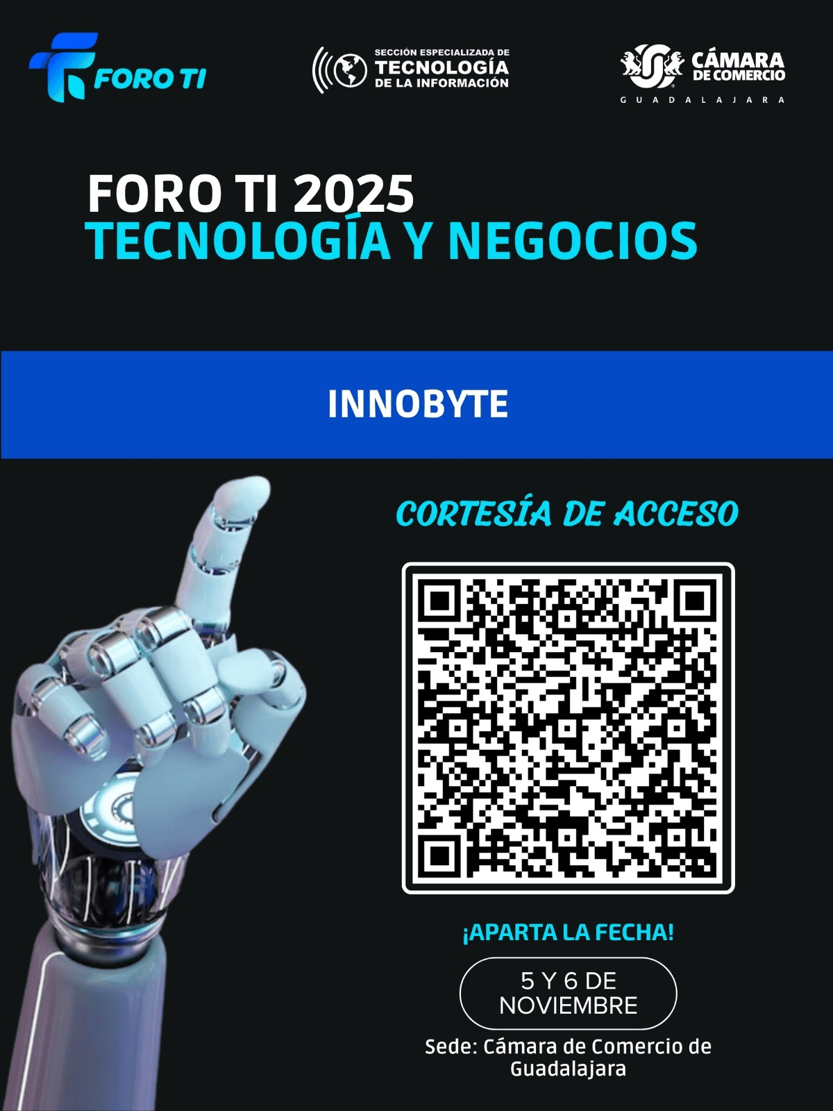 Foro de TI de Camara de Comercio de Guadalajara es un evento que se realiza todos los años dentro de la sección de TI. Estas sección es la que agrupa empresas de la rama de tecnologías de la información y el evento está pensado para atraer a otras empresas a conocer tendencias, nuevas tecnologías y empresas que conforman la sección de tecnologías de información de Cámara de Comercio de Guadalajara.